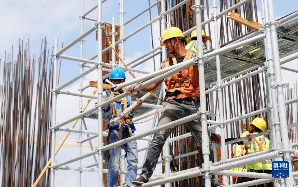 8月29日,工人在臨港西島金融中心項目工地上,安裝用于塔樓剪力墻鋼筋綁扎的腳手架。