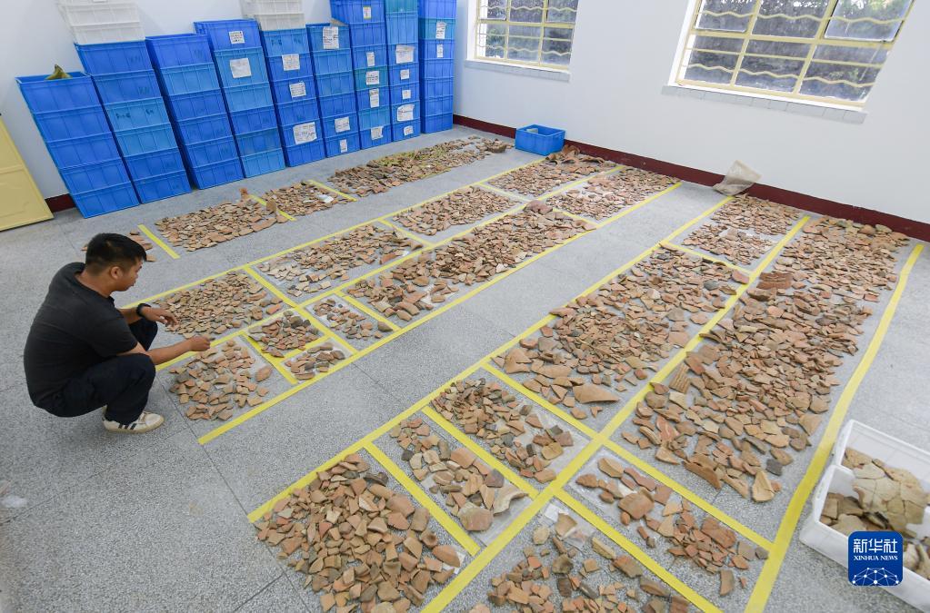 考古工作人員在南佐遺址研究基地整理出土的大量陶片(8月25日攝)。