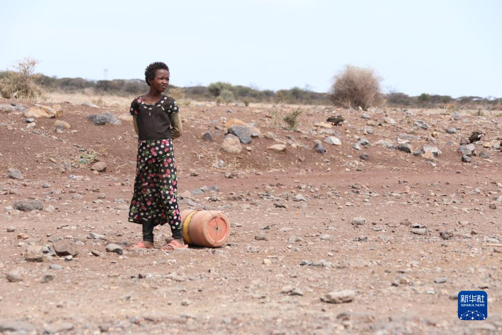 8月26日,在遭受旱災的肯尼亞馬薩比特郡萊薩米斯鎮,一名取水的女孩在路邊眺望。