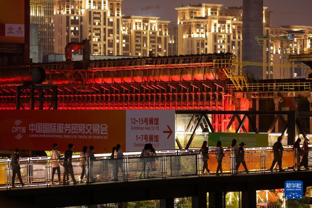 8月29日,媒體記者在服貿會(huì )媒體探營(yíng)活動(dòng)中參觀(guān)首鋼園區夜景。
