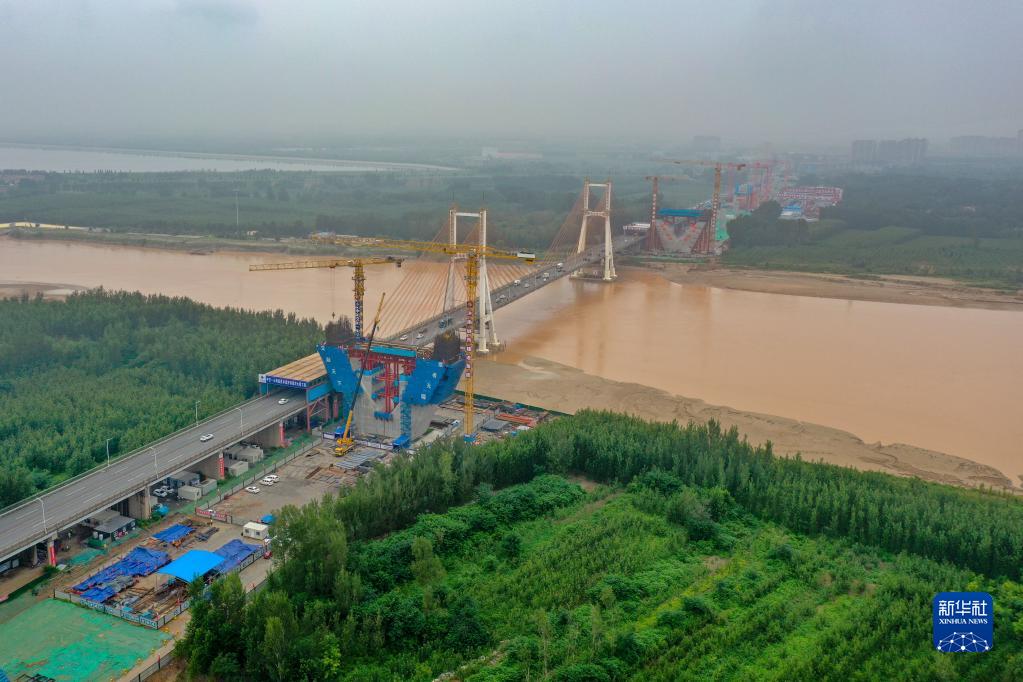 8月30日拍攝的濟南黃河公路大橋擴建工程施工現場(chǎng)(無(wú)人機照片)。