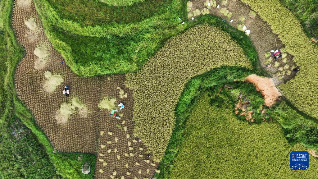8月30日,村民在羅甸縣沫陽(yáng)鎮紅星村收割稻谷(無(wú)人機照片)。