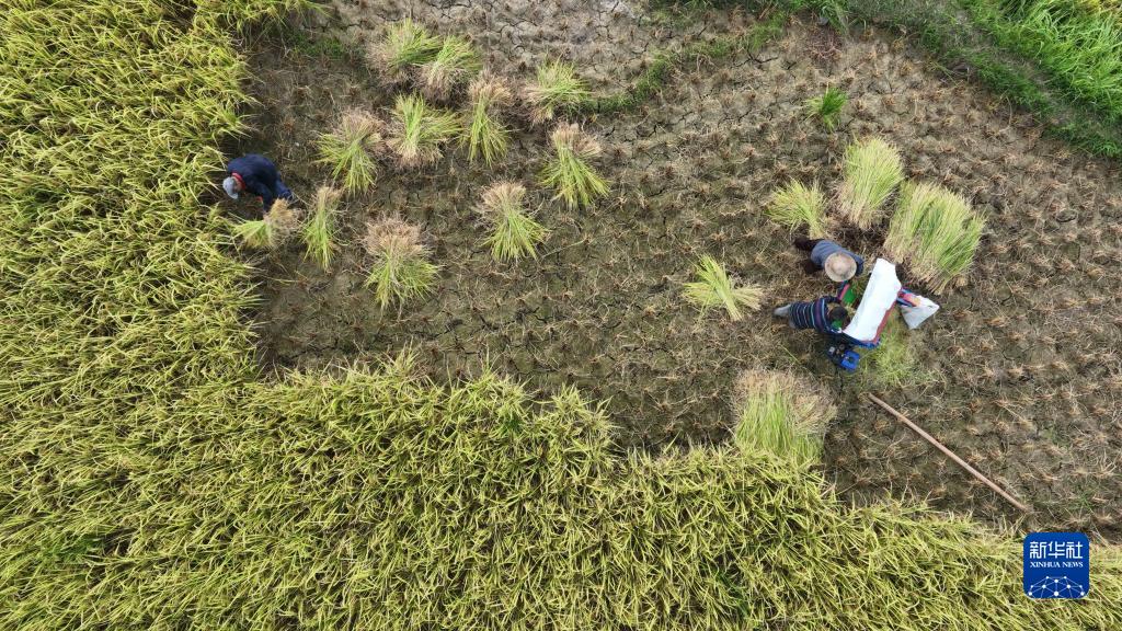 8月30日,村民在羅甸縣沫陽(yáng)鎮紅星村收割稻谷(無(wú)人機照片)。