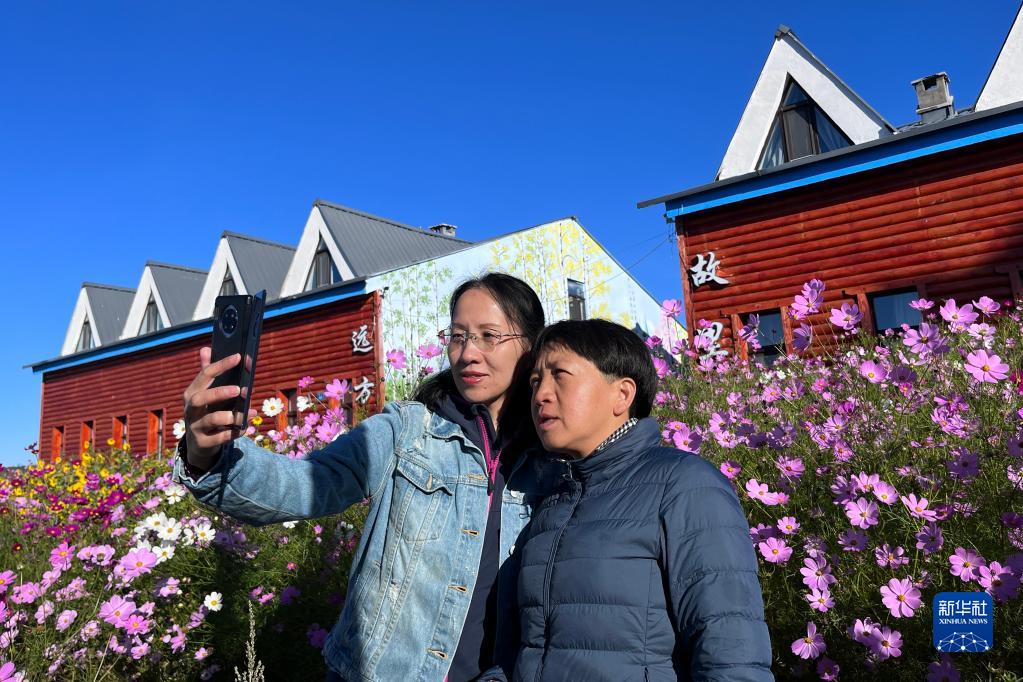 在黑龍江省漠河市北極鎮北紅村,游客在格?;ㄇ芭恼樟粲埃?月27日攝)。