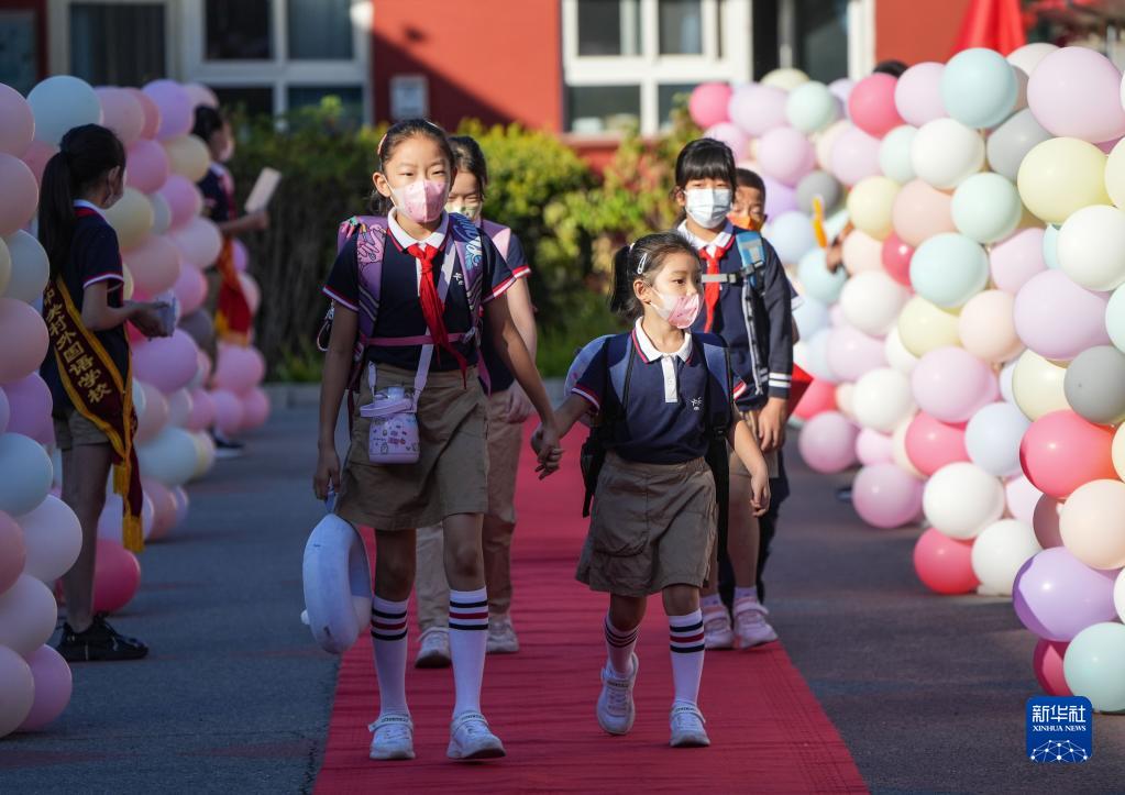 9月1日,在北京市中關(guān)村外國語(yǔ)學(xué)校小學(xué)部,同學(xué)們走進(jìn)學(xué)校。