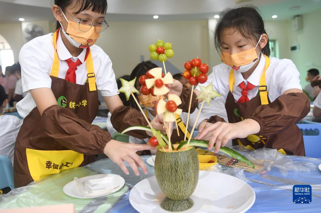 9月1日,廣州市鐵一小學(xué)的學(xué)生在勞動(dòng)課上制作水果拼盤(pán)。