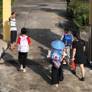 9月1日,在福建省永泰縣白云鄉鳳際小學(xué),老師林萬(wàn)注在校門(mén)口迎接到校的學(xué)生和家長(cháng)(無(wú)人機照片)。