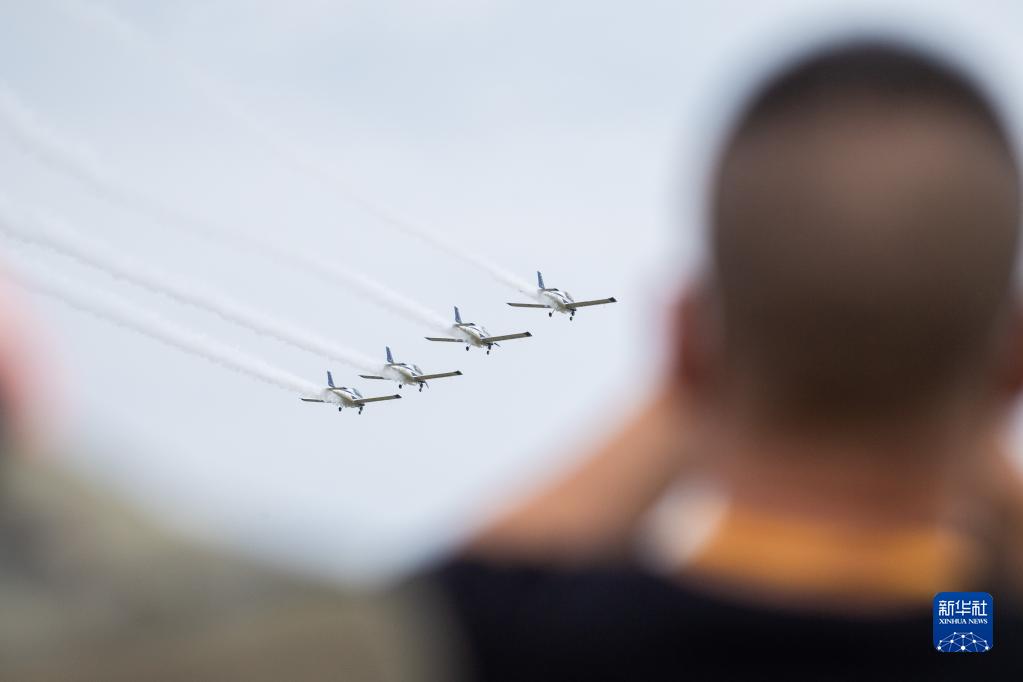9月1日,在湖南株洲蘆淞機場(chǎng),觀(guān)眾觀(guān)看固定翼編隊飛行表演。