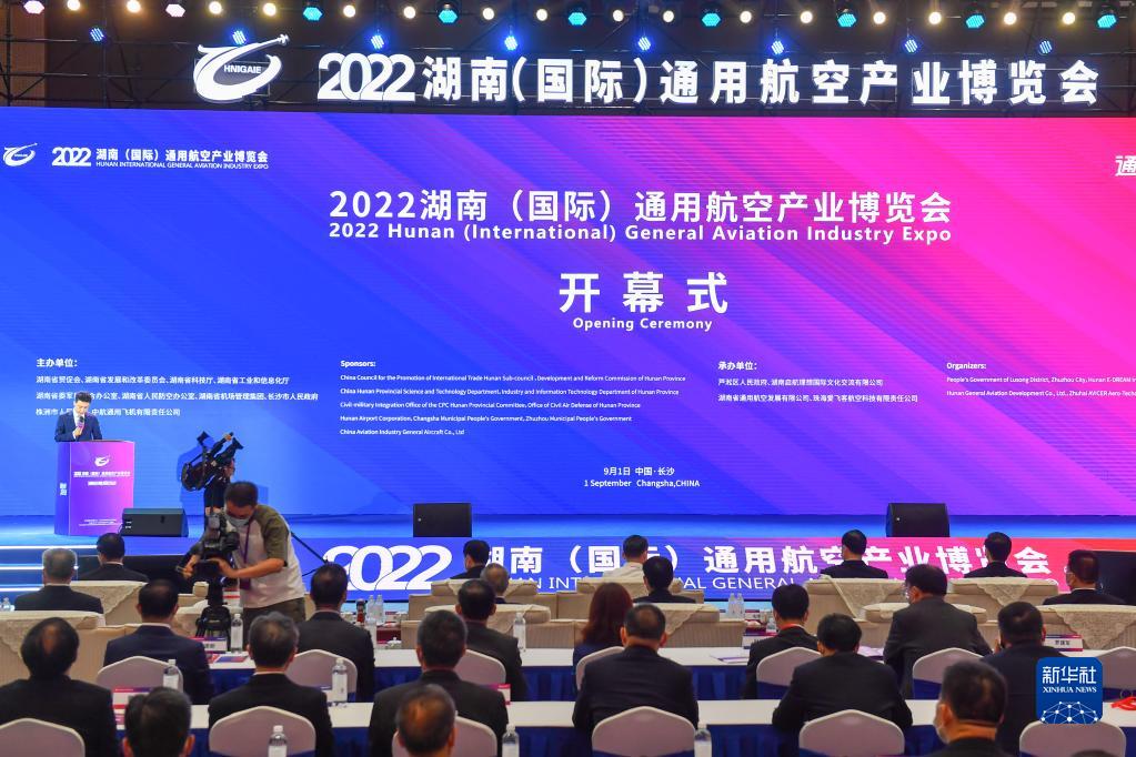 這是9月1日在湖南長(cháng)沙國際會(huì )展中心拍攝的2022湖南(國際)通用航空產(chǎn)業(yè)博覽會(huì )開(kāi)幕式現場(chǎng)。