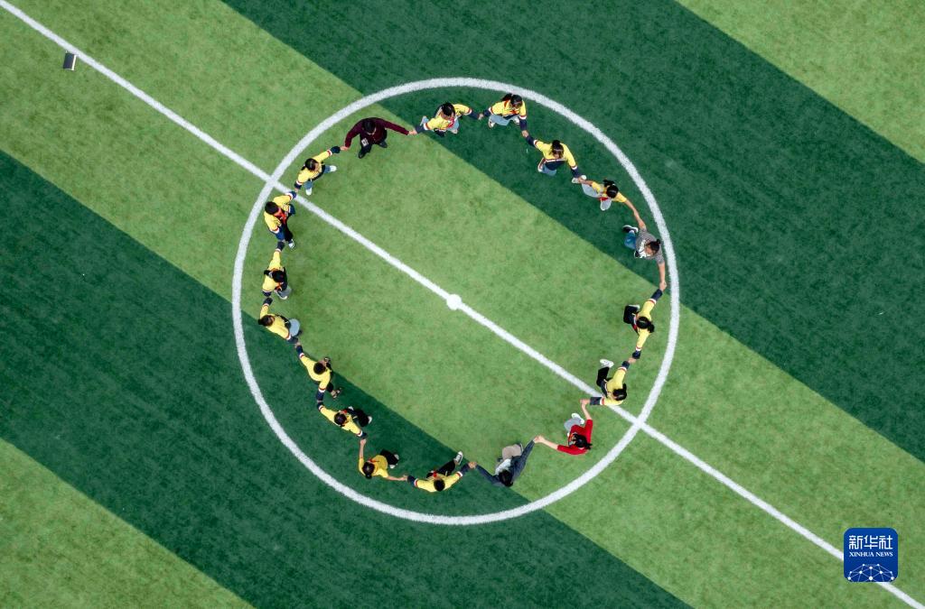9月1日,貴州省黔西市定新小學(xué)學(xué)生在操場(chǎng)上做游戲(無(wú)人機照片)。