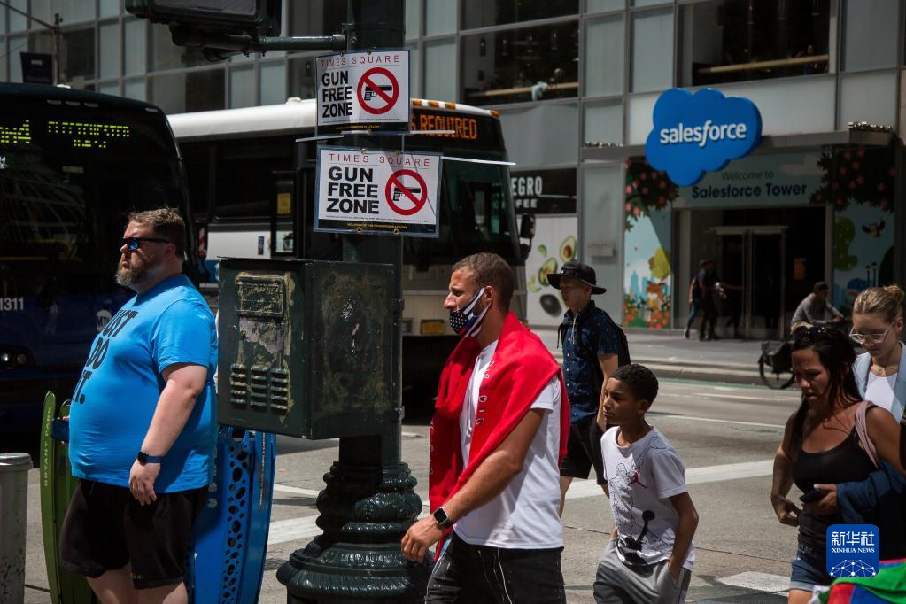 9月1日,人們從美國紐約時(shí)報廣場(chǎng)鄰近街區的“禁槍區”標志牌旁走過(guò)。