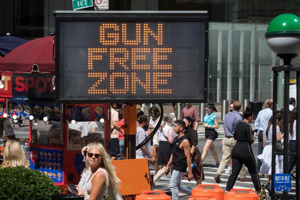 9月1日,人們從美國紐約時(shí)報廣場(chǎng)鄰近街區的“禁槍區”標志牌旁走過(guò)。