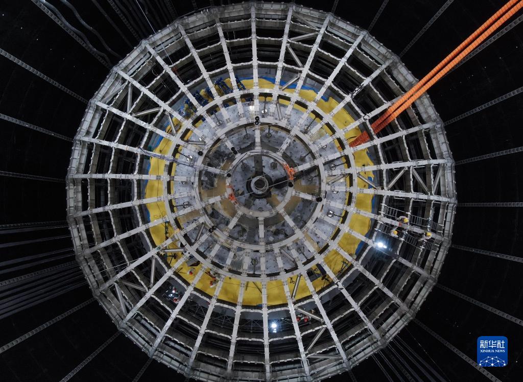 這是9月2日拍攝的位于地下700米的江門(mén)中微子實(shí)驗探測器,呈現出巨大的球形結構(無(wú)人機照片)。