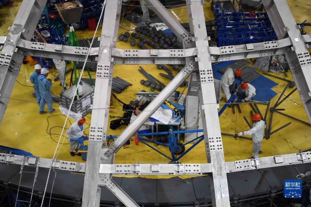 9月2日,工作人員在江門(mén)中微子實(shí)驗探測器不銹鋼結構內部的升降平臺上安裝作業(yè)。新華社記者 鄧華 攝