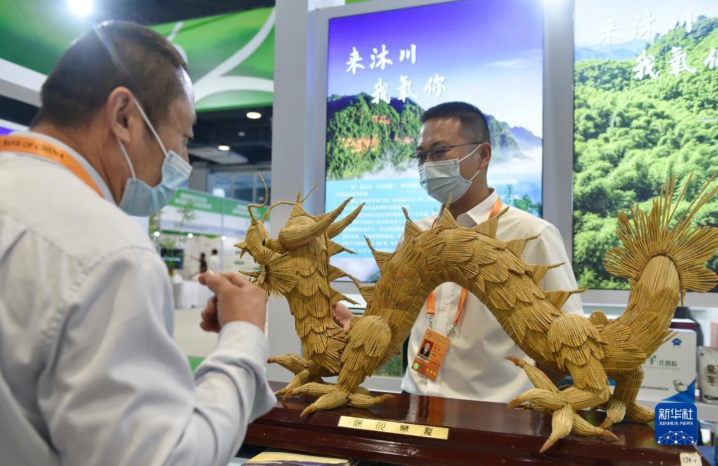 9月2日,在服貿會(huì )國家會(huì )議中心二期展館內,工作人員(右)向觀(guān)眾介紹展出的沐川草龍。新華社記者 魯鵬 攝