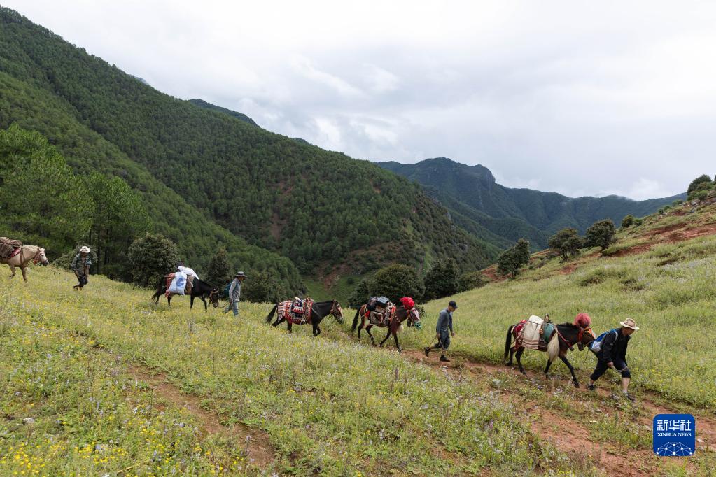 瀘沽湖馬幫隊的隊員們在下山途中(9月2日攝)。