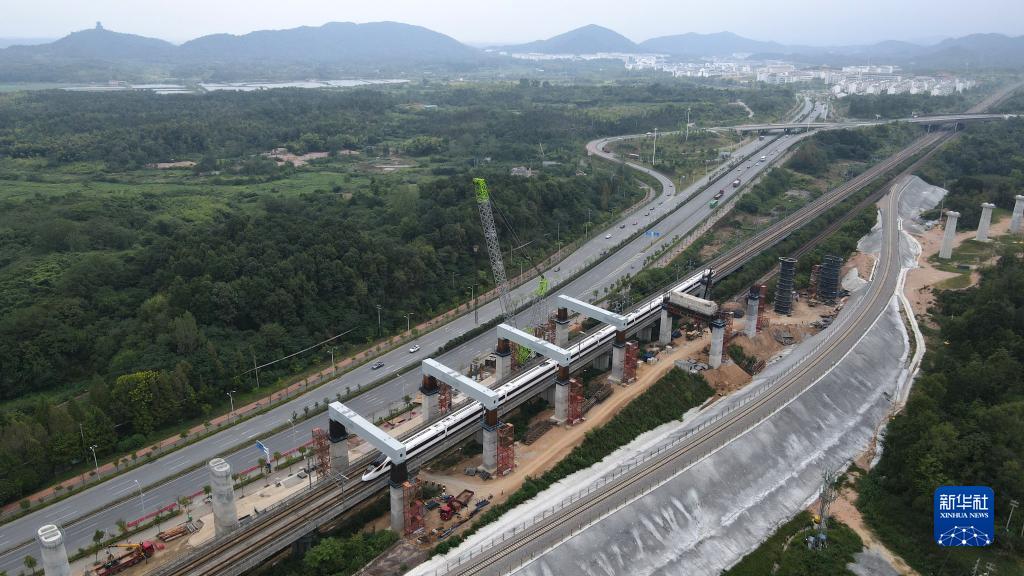 9月3日,一列高鐵列車(chē)經(jīng)過(guò)完成吊裝后的門(mén)式墩鋼蓋梁(無(wú)人機照片)。