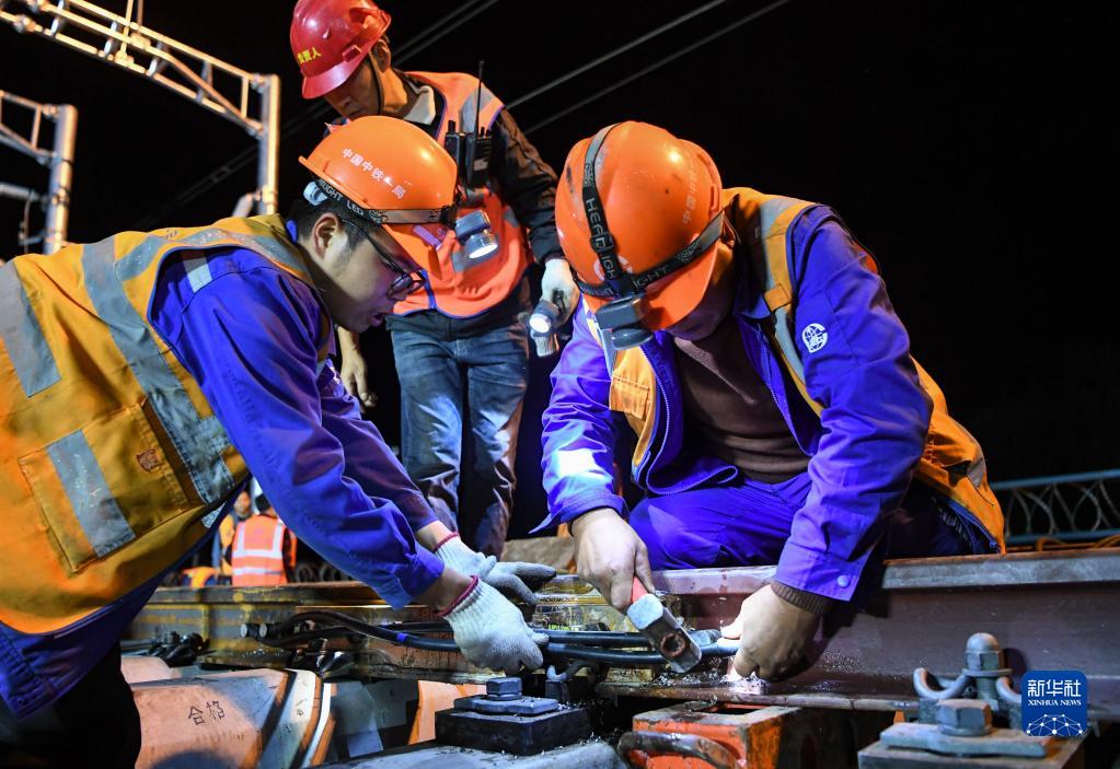 9月2日晚,工人在渝利鐵路沙子站增設客運設施項目作業(yè)。