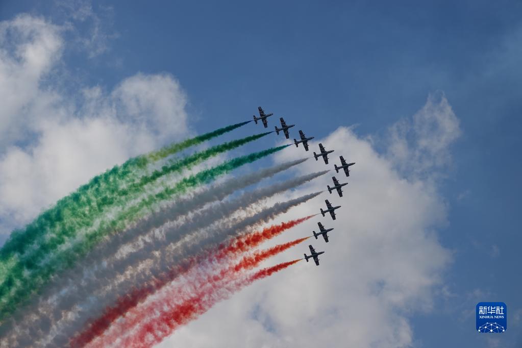 9月2日,意大利“三色箭”飛行表演隊在奧地利“空中力量-2022”航展上表演。