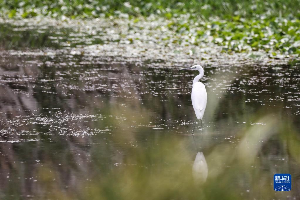 9月3日,一只白鷺在河南省寶豐縣城玉帶河畔棲息。