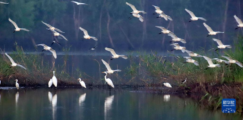 8月31日,一群白鷺在河北省玉田縣石臼窩鎮的河灘地覓食、飛舞。