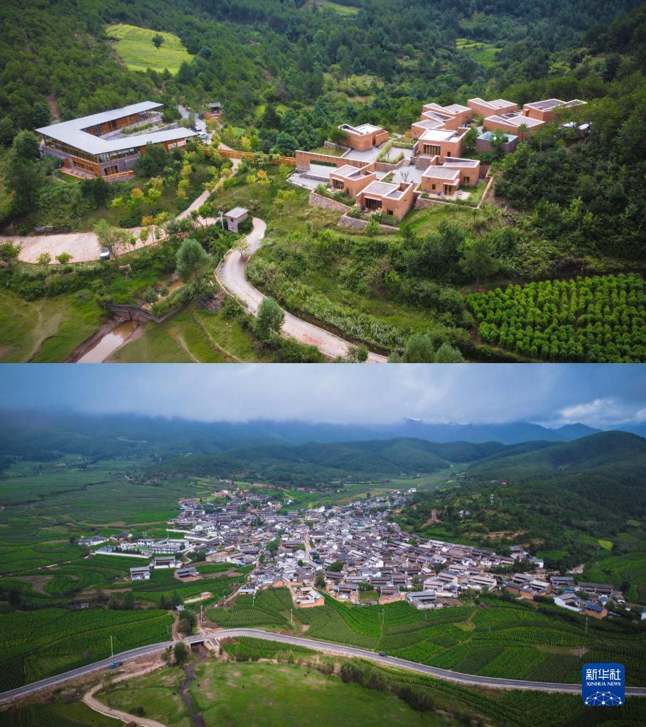 拼版照片:上圖為位于云南省沙溪鎮石龍村的喜林苑沙溪店(8月31日攝,無(wú)人機照片);下圖為喜林苑沙溪店所在的石龍村(8月31日攝,無(wú)人機照片)。