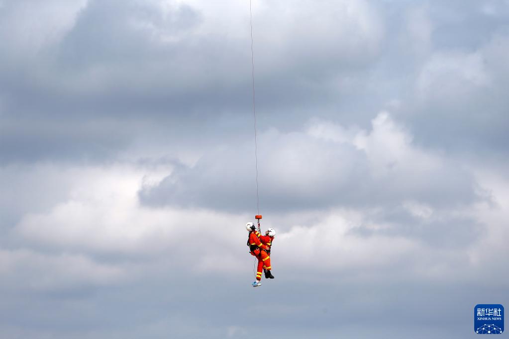 9月4日,在羅馬尼亞布加勒斯特,一名醫生抱著(zhù)“病人”進(jìn)行直升機救護演示。