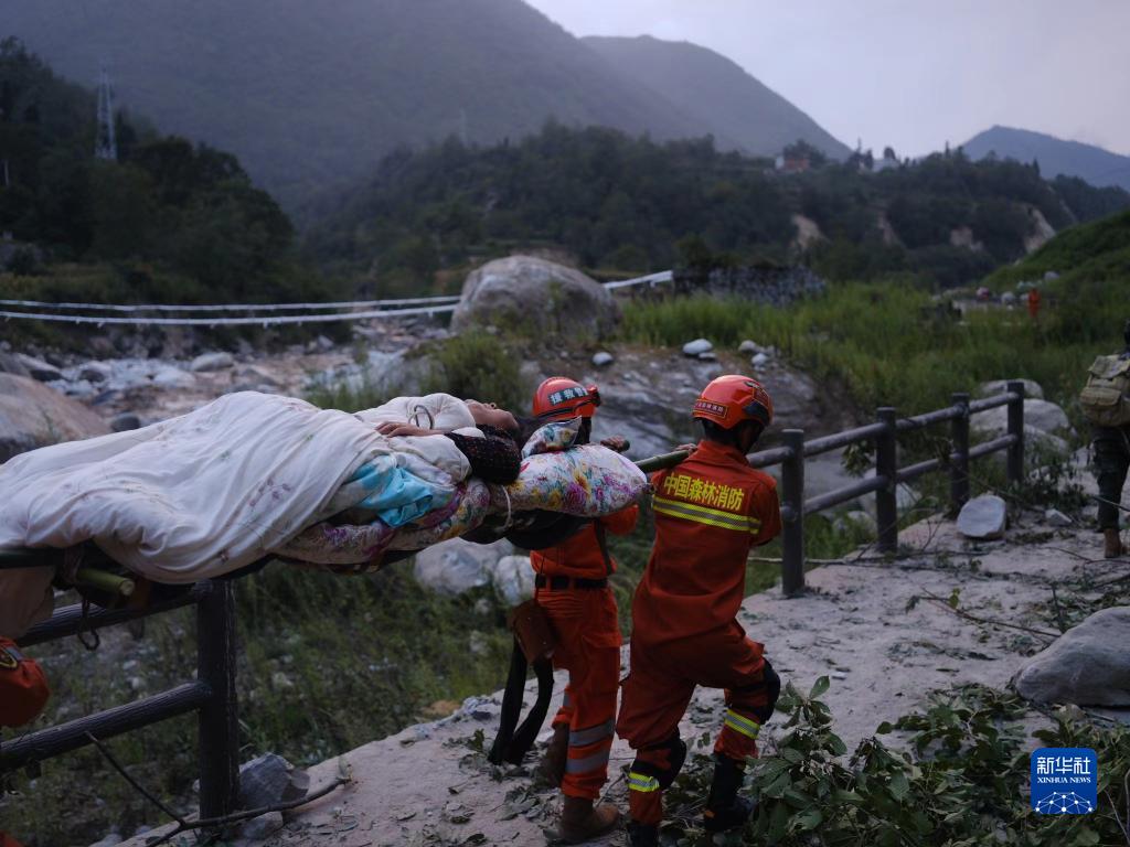 9月5日,四川森林消防總隊甘孜支隊消防員在瀘定縣磨西鎮青崗坪村轉移傷員。