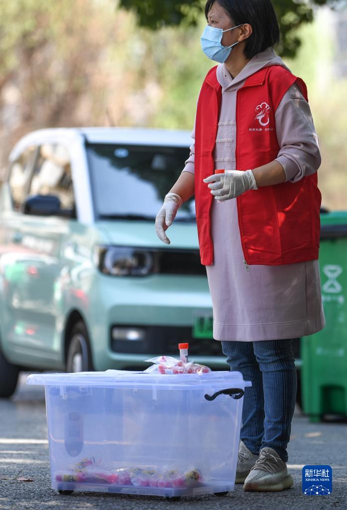 9月5日,在貴陽(yáng)市云巖區大營(yíng)路街道中天花園社區核酸檢測現場(chǎng),一名志愿者在轉運核酸檢測樣本。