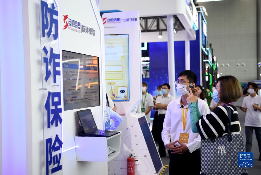9月5日,參展人員在2022年國家網(wǎng)絡(luò )安全宣傳周網(wǎng)絡(luò )安全博覽會(huì )上介紹防詐保險。