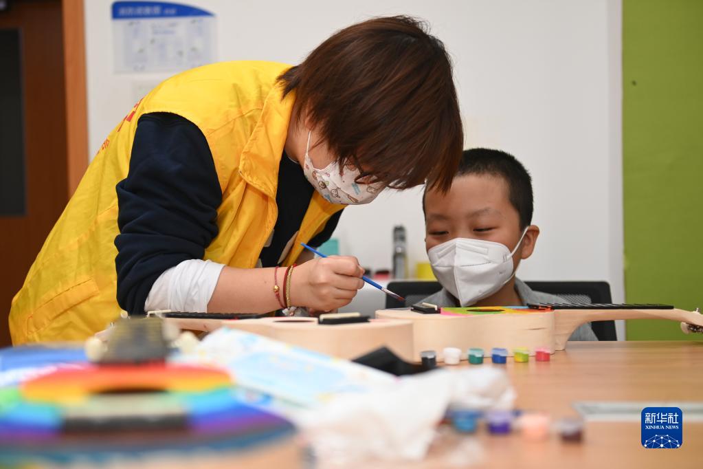 8月30日,在北京高博博仁醫院的“病房學(xué)?!眱?,教師施邸昕在手工課上指導小曲(化名)繪制尤克里里。