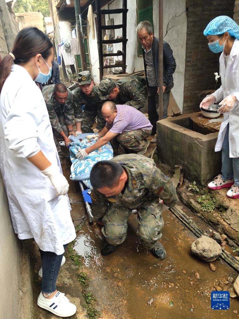 9月5日,武警四川總隊雅安支隊執勤四中隊官兵在雅安市石棉縣王崗坪彝族藏族鄉挖角村救助被困群眾(手機照片)。新華社發(fā)(何虹岑 攝)