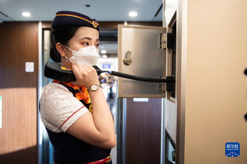 9月6日,在渝廈高鐵益長(cháng)段長(cháng)沙首發(fā)G6518次列車(chē)上,乘務(wù)人員向乘客們播報列車(chē)信息。