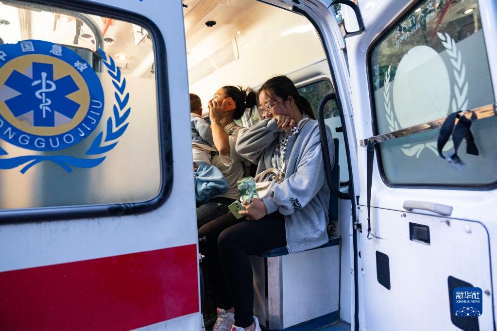9月6日,在石棉縣中學(xué)的臨時(shí)起降點(diǎn),一位從石棉縣幸福村轉運來(lái)的孕婦(右)下了直升機后坐上救護車(chē)。她與家人通話(huà)后激動(dòng)不已。