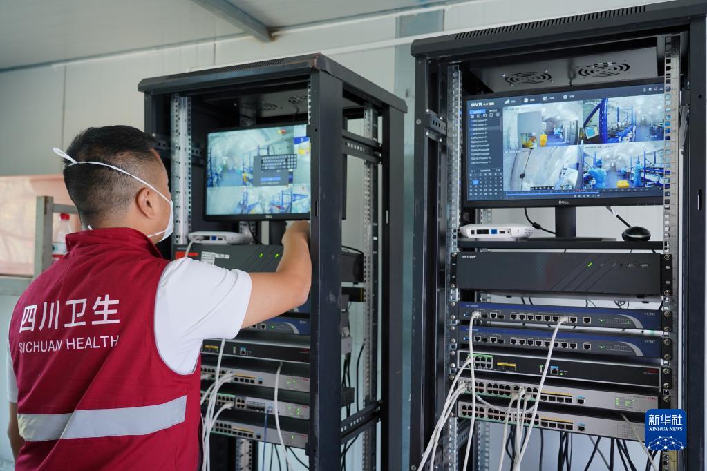 9月5日,核酸檢測隊工作人員在監控氣膜方艙實(shí)驗室內情況。