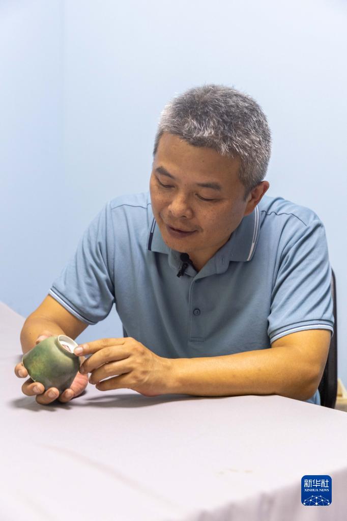8月23日,上海市文物保護研究中心副主任翟楊展示長(cháng)江口二號古船出水文物綠釉杯。