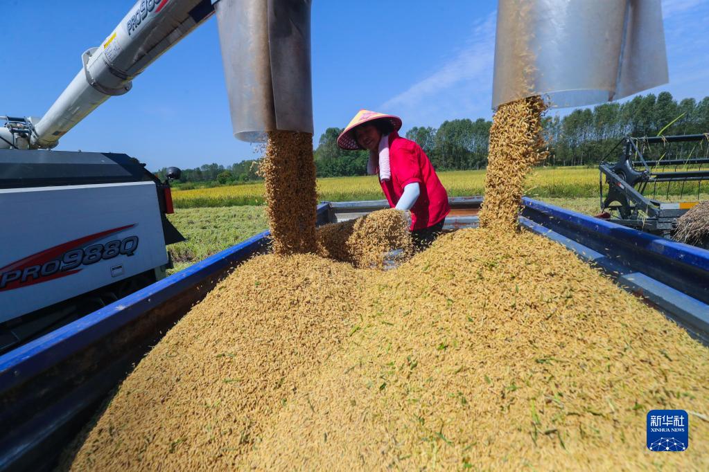 9月6日,河南省信陽(yáng)市光山縣羅陳鄉張樓村青龍河合作社社員在收水稻。