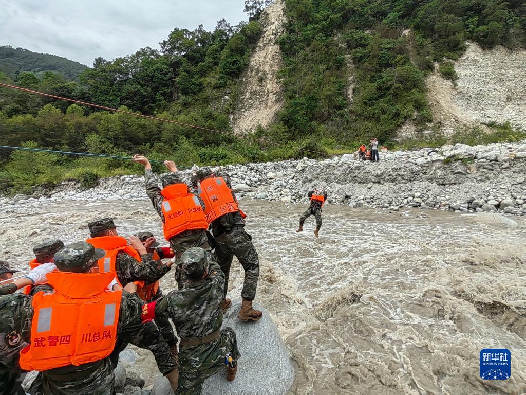 9月6日,武警四川總隊甘孜支隊救援官兵在瀘定縣磨西鎮通過(guò)繩索前往河對岸,救助被困群眾。新華社發(fā)(張文軒 攝)