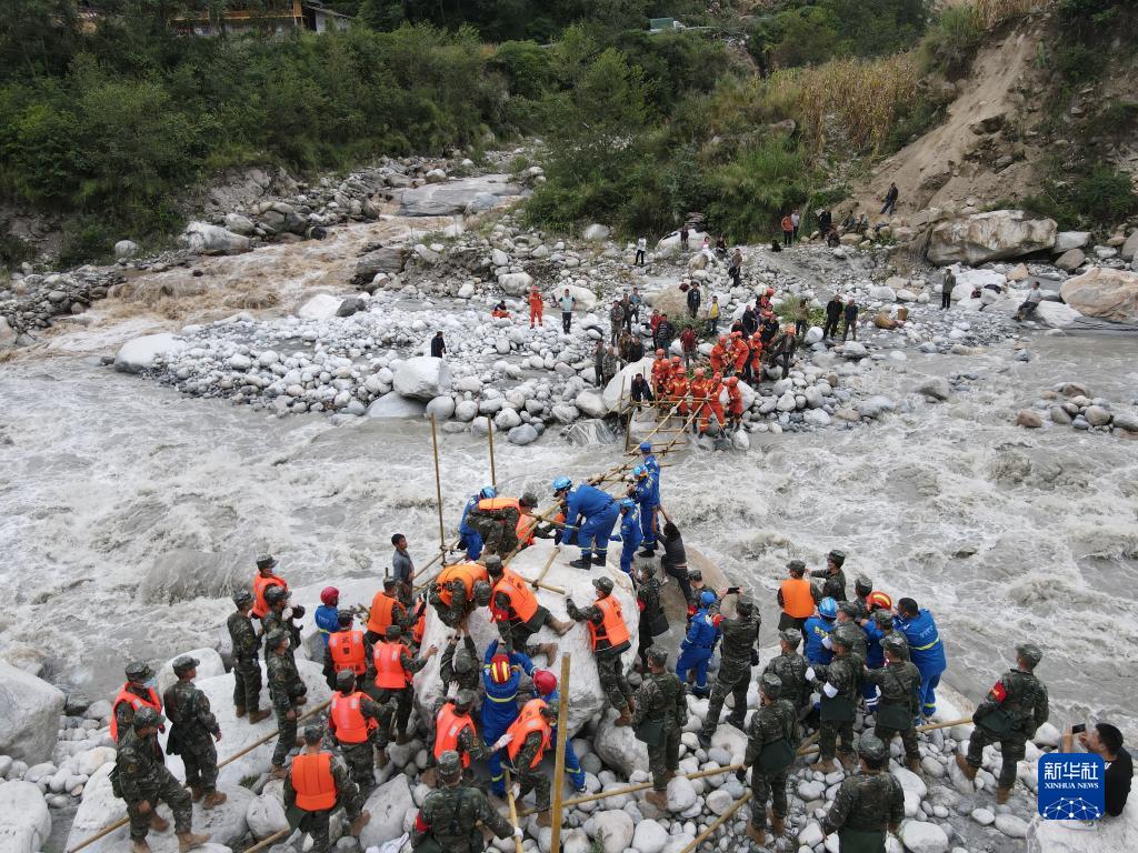 9月6日,武警四川總隊甘孜支隊救援官兵在瀘定縣磨西鎮燕子溝河谷,與多方救援力量一起搭建通往磨子溝村的橋梁。新華社發(fā)(葉小龍 攝)