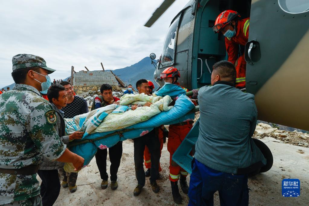 9月6日,救援人員抬著(zhù)一名從瀘定縣得妥鎮灣東村疏散出來(lái)的受傷村民,準備通過(guò)直升機將其運出。