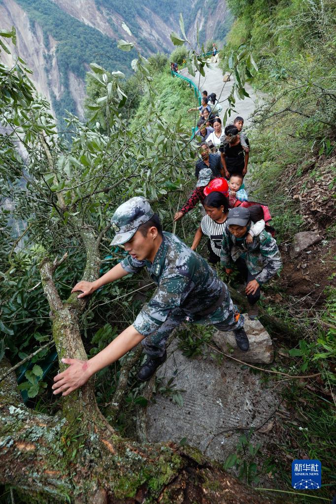 9月6日,救援人員幫助瀘定縣得妥鎮灣東村村民向外疏散。
