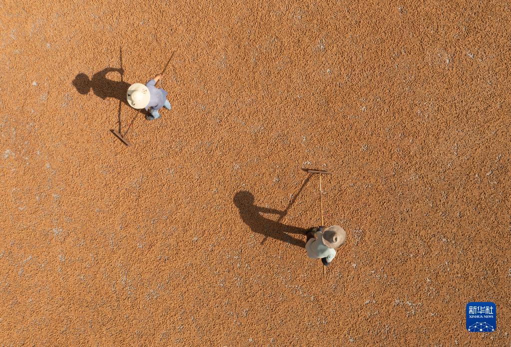 9月7日,在淳安縣臨岐鎮的山核桃“共富工坊”加工企業(yè)內,當地村民晾曬剛采收的山核桃(無(wú)人機照片)。