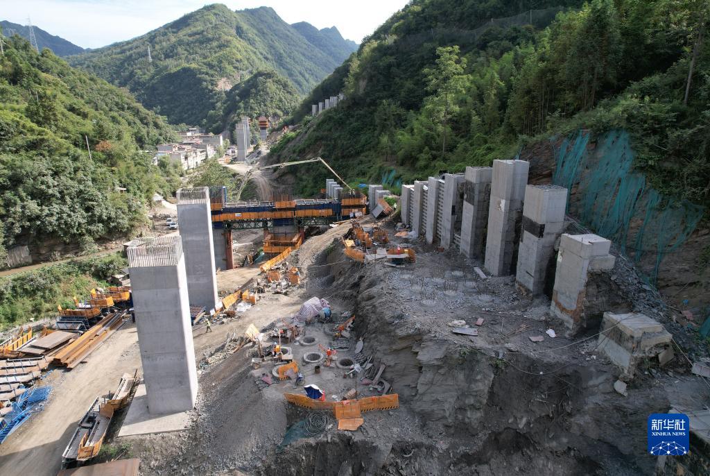 建設中的西康高鐵桐木車(chē)站特大橋(9月6日攝,無(wú)人機照片)。