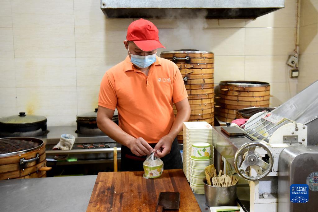9月6日,孫玉喜在早餐店內為顧客打包早餐。