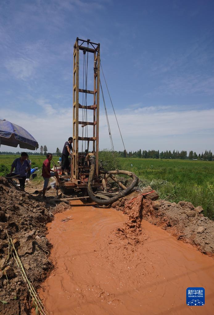 9月7日,在位于鄱陽(yáng)湖畔的南昌市高新區鯉魚(yú)洲管理處蔬菜場(chǎng)二十七大隊,工人使用機械進(jìn)行打井作業(yè)。