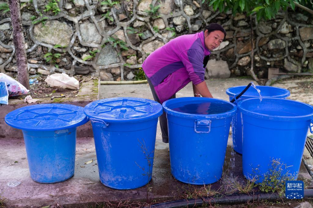 9月7日,在雅安市石棉縣王崗坪彝族藏族鄉幸福村二組,一名村民在接山泉水,這股山泉水是村民們從山上引下來(lái)的。
