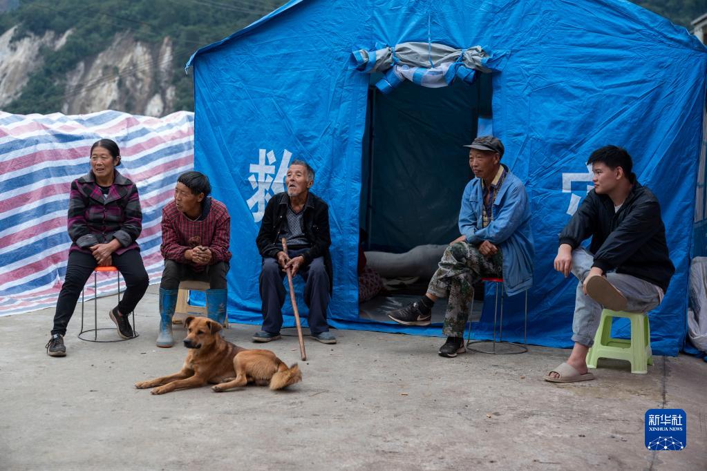 9月7日,在雅安市石棉縣王崗坪彝族藏族鄉幸福村二組,村民們在帳篷外休息。