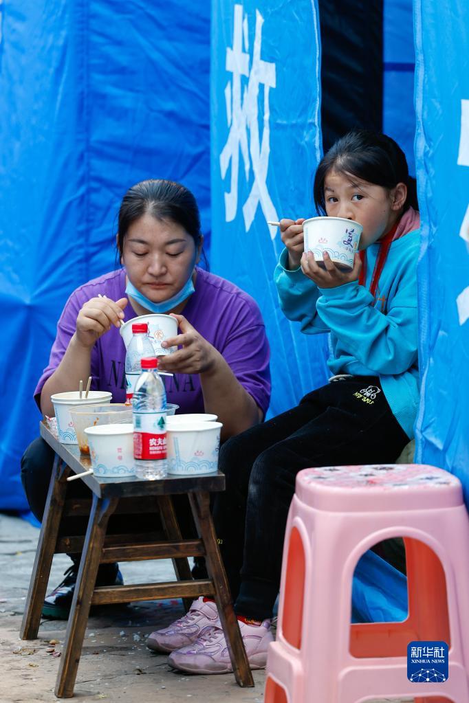 9月7日,在瀘定縣磨西鎮的地震災后安置點(diǎn),人們在吃飯。