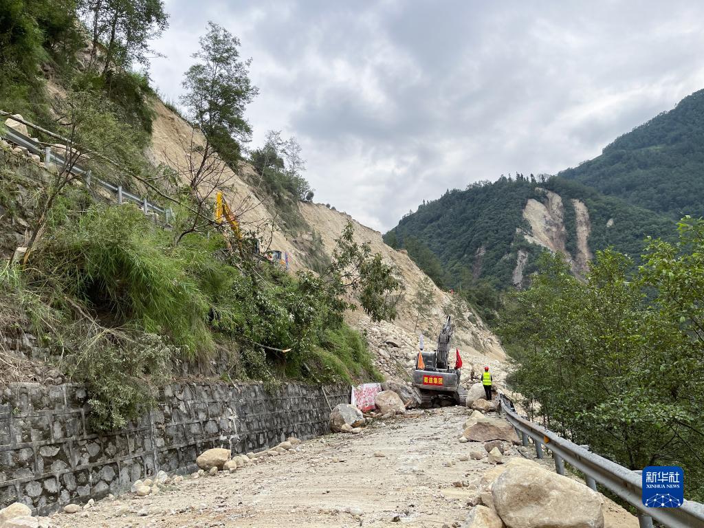 9月7日,在四川省甘孜州瀘定縣磨西鎮附近,四川路橋的工作人員在搶修通往海螺溝景區的道路。