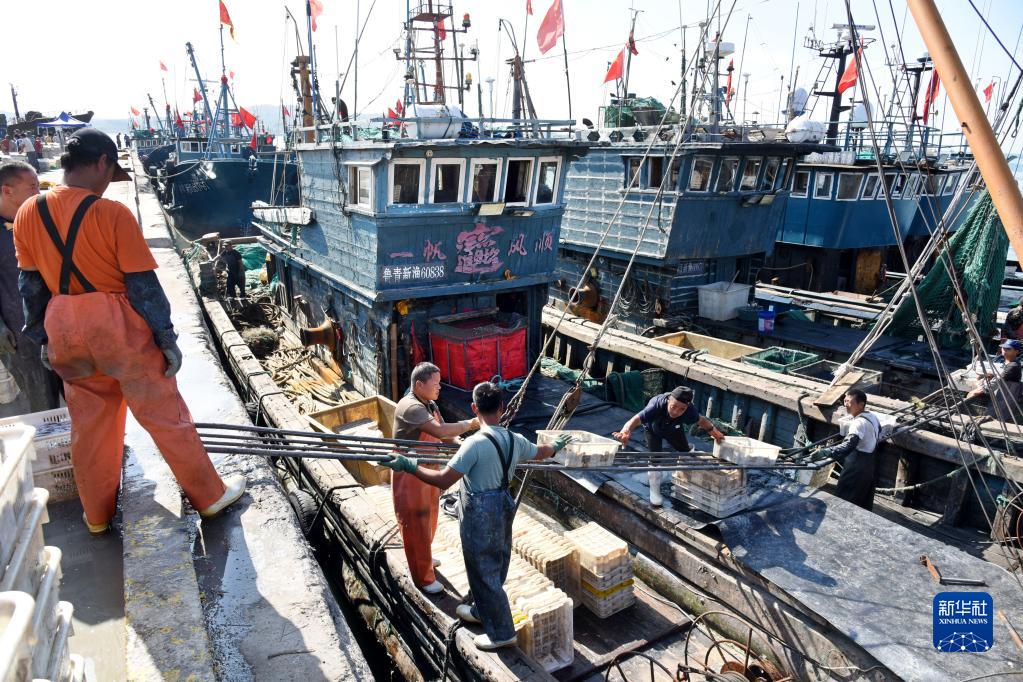 9月7日,在青島西海岸新區積米崖漁港碼頭,漁民們忙著(zhù)卸下漁獲。 新華社記者 李紫恒 攝